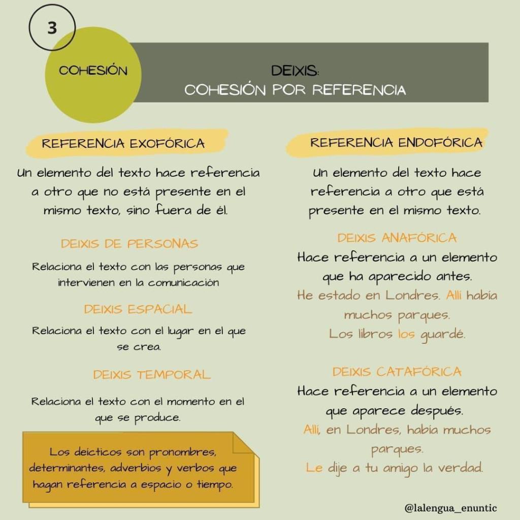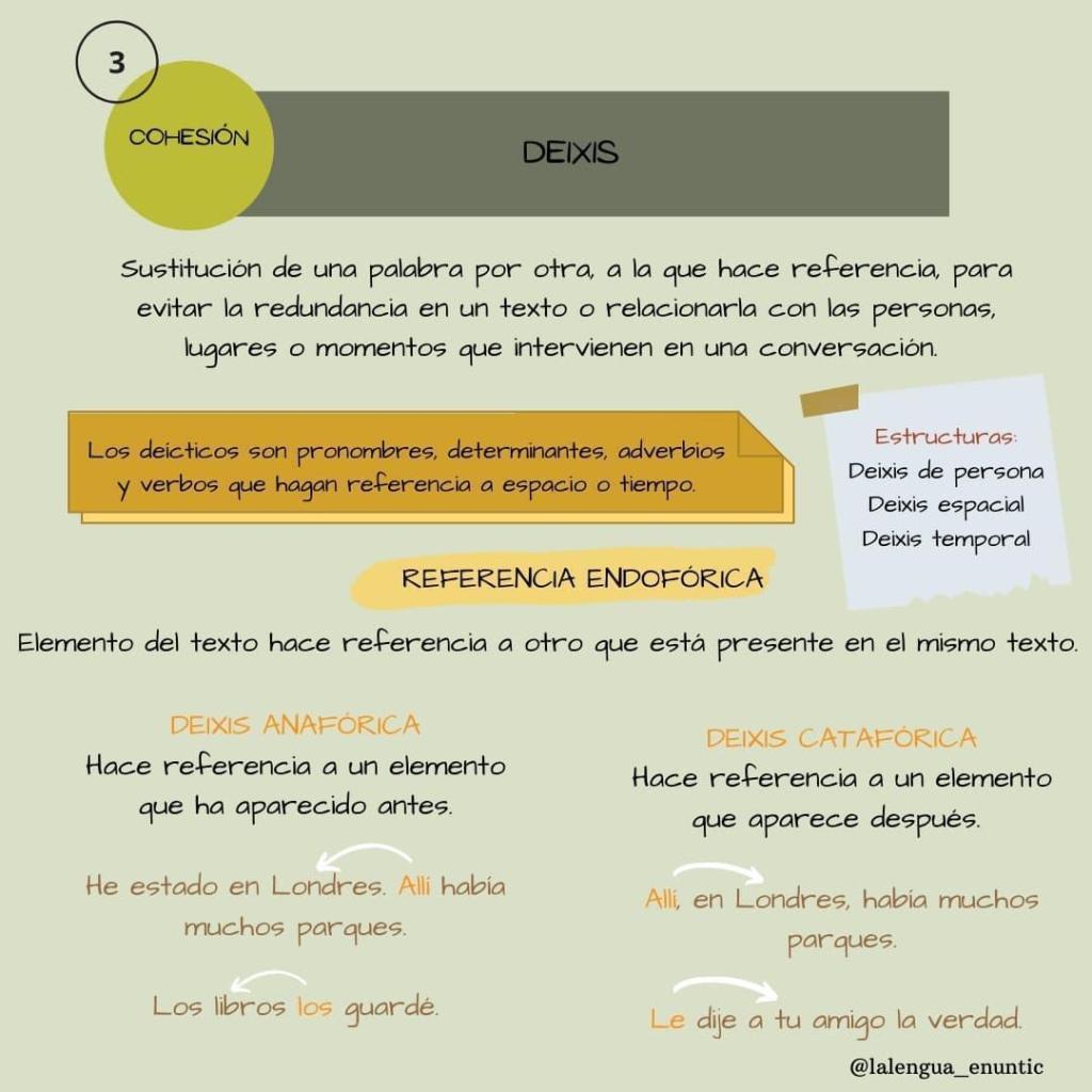 Las propiedades básicas del texto son la adecuación, coherencia y cohesión. Este último punto es el que vamos a tratar. Lo primero de todo: ¿sabes qué es la cohesión textual? Son procedimientos lingüísticos que relacionan entre sí los elementos de un texto para que resulte coherente, ya sean léxicos, gramaticales o conectores. Eso sí, para que sean mecanismos de cohesión, tienen que verse de manera continuada a lo largo del texto; una única deixis no sería significativa como mecanismo de cohesión del texto.
