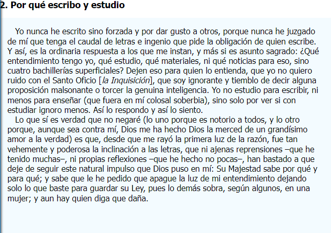 Otra de sus luchas con la pluma era reivindicar el derecho de la mujer a la educación y al conocimiento, como podéis leer en su autobiografía en prosa: Respuesta a sor Filotea de la Cruz, una aguda e inteligente respuesta a las recriminaciones que le hizo un obispo que utilizó el pseudónimo de Filotea de la Cruz (Manuel Fernández de Santa Cruz y Sahagún, obispo de Guadalajara y de Puebla).