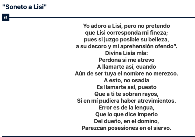 Además de este bonito y profundo viaje onírico, escribió en náhuatl y abordó temas filosóficos y morales en sus poemas barrocos. Aquí puedes consultar una selección de poemas recopilada por Women’s Legacy y un par de ejemplos dedicados a un gran amor: Lisi.