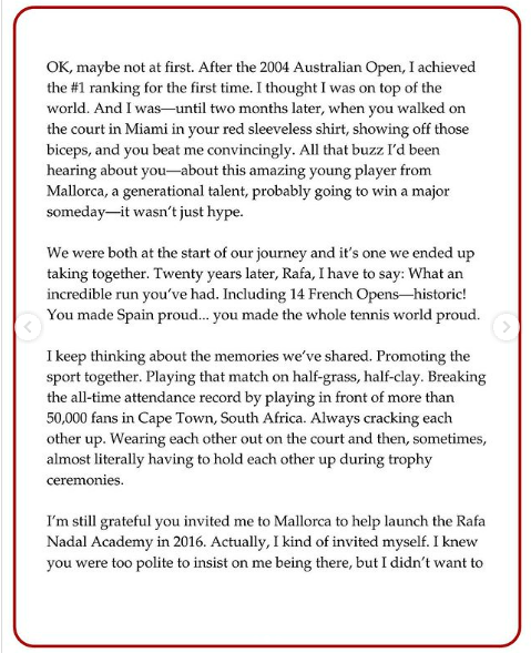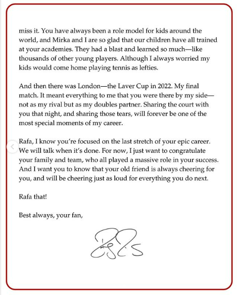Vamos a ver un ejemplo de deportividad y de cómo escribir una carta. Esta es la epístola original que Roger Federer le escribió a Rafa Nadal antes de su despedida como tenista.