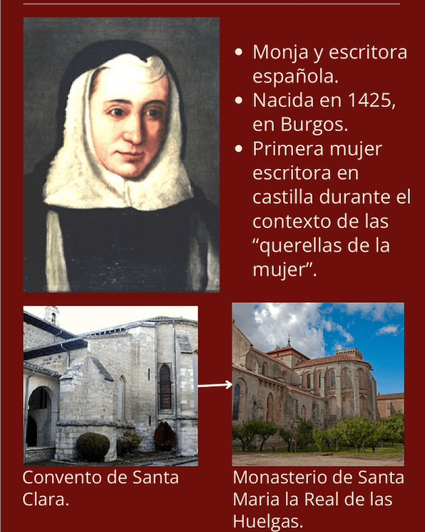 Esta mujer no aparece en prácticamente ningún libro de texto, pero fue -junto con Leonor Centelles, la marquesa de Cotrone- la única mujer (entre 700 hombres) que aparece en el Cancionero General del siglo XV. Os dejo una presentación sobre sus poemas y su misteriosa vida, realizado por una alumna.