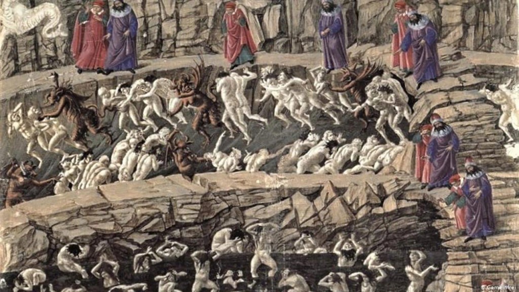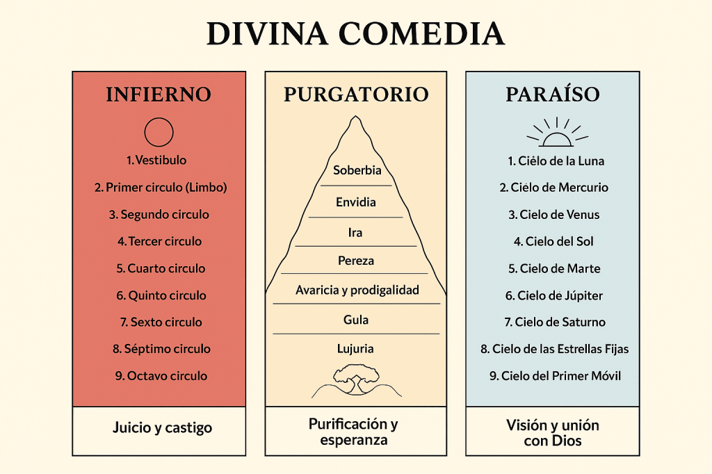 Una de las obras cumbre de este periodo es La Divina Comedia, de Dante Alighieri, que sigue, a grandes rasgos, la siguiente estructura:
