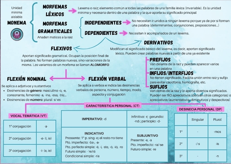 MONEMA: es la unidad mínima aislable. Estos monemas se unen para formar los MORFEMAS, que se dividen, a su vez, en el LEXEMA (raíz o morfemas léxicos) y los AFIJOS (morfemas gramaticales)